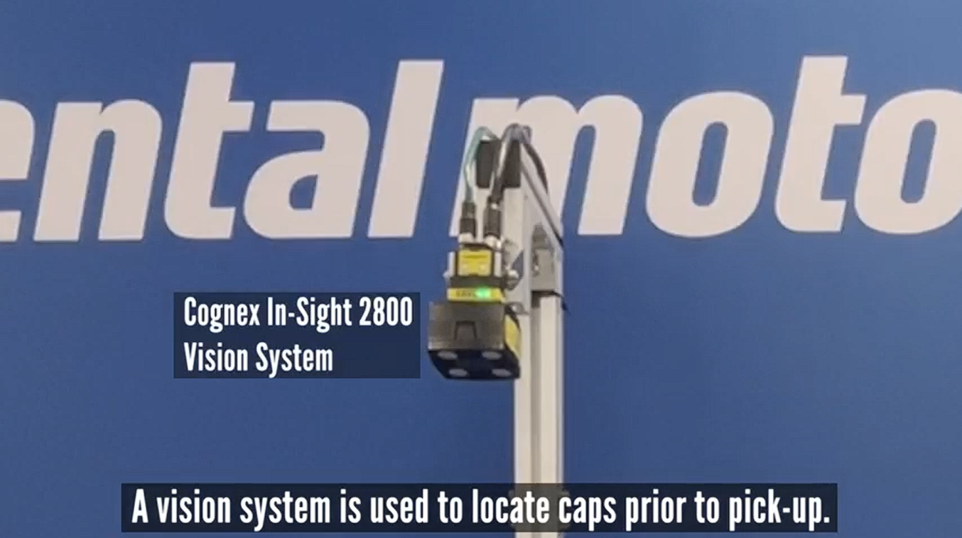 Bottle caps rarely arrive in perfectly aligned positions. Rather than relying on bowl feeders or complex mechanical alignment, this system integrates a vision‑guided picking process using a Cognex 2800 series camera. The camera captures bottle cap locations and orientation data, which is then transmitted directly to our MRCU "all-in-one" integrated robot controller. Without first acquiring this data from the vision camera, a robot cannot determine the location of the bottle cap.